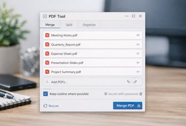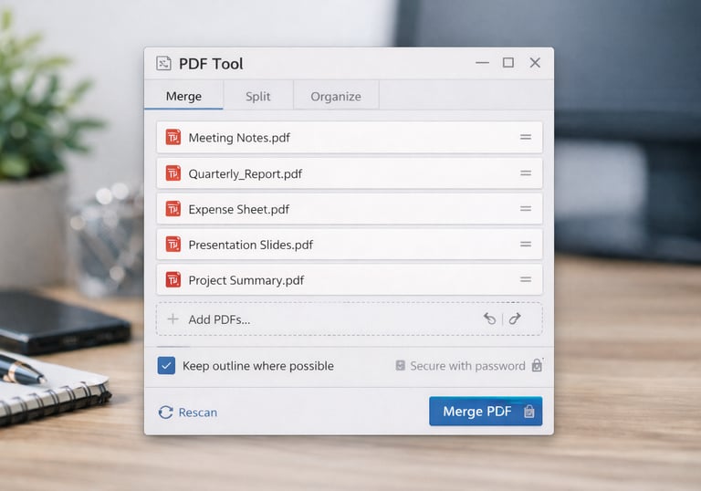A streamlined PDF tool that lets you merge, split, and organize PDF files quickly and securely, making document management simple and efficient.