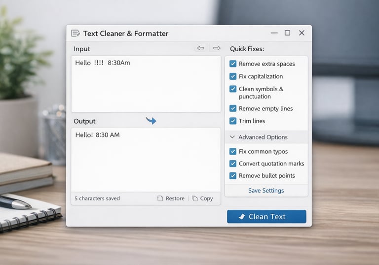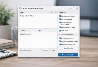 A simple text cleaner and formatter that removes unwanted characters, fixes spacing, and instantly standardizes text so it’s clean, consistent, and ready to use anywhere.