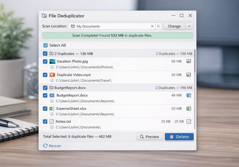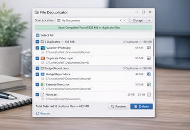 A light file deduplicator that quickly scans your system to identify and safely remove duplicate files, freeing up space and keeping your folders organized.